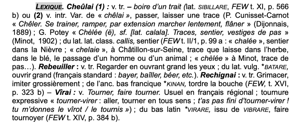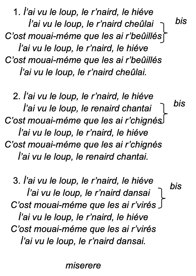 « J’ai vu le loup, le renard, le lièvre boire à la pinte (cheuler, en ancien patois dijonnais [traduction discutable : infra]) ;